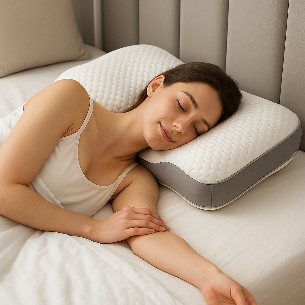 Almohada ergonómica diseñada para aliviar tensión cervical y mejorar la calidad del sueño.